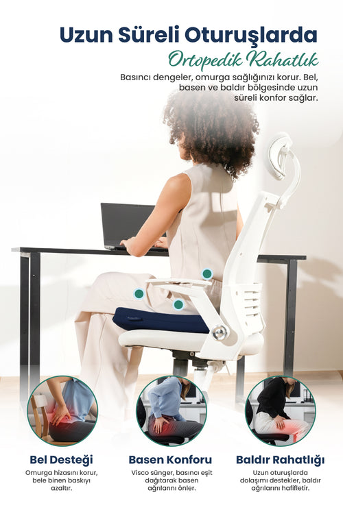 Kesinlikle. Isıya duyarlı visco teknolojisi, oturduğunuzda vücudunuzun şeklini alarak basıncı minimize eder. Omurganızın doğal eğrisini destekleyen özel tasarımı sayesinde gün boyu çok daha dinç ve ağrısız kalmanıza yardımcı olur, konforu artırır.